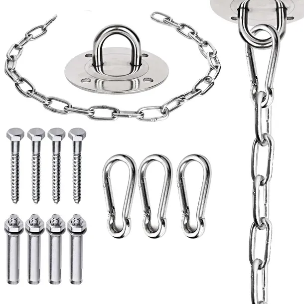 W skład zestawu wchodzą wszystkie niezbędne elementy, takie jak wytrzymały łańcuch, karabińczyki, wkręty i uchwyt do łatwego zawieszenia. Nie musisz już niczego dodatkowo dokupować - wszystko, czego potrzebujesz, znajduje się w jednym, przydatnym opakowaniu.